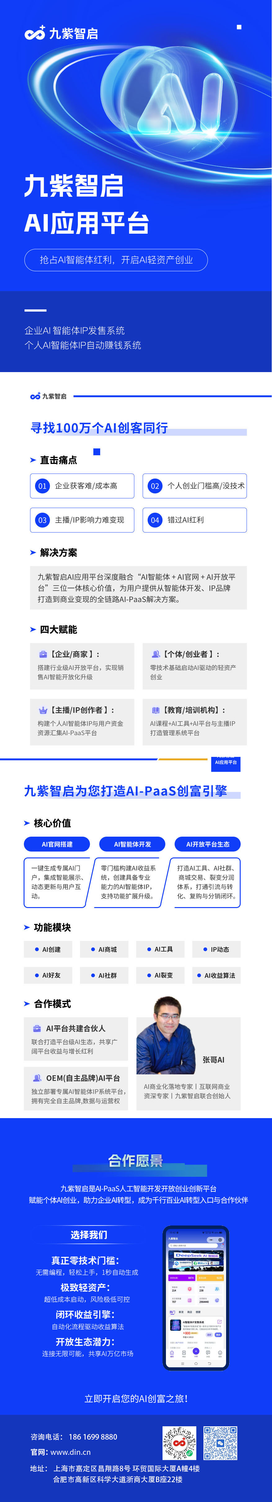🔍 当下你是否面临挑战? ➤ 寻找高潜力AI项目却无从下手? ➤ 渴望抓住2025年AI风口却缺靠谱路径? ➤ 企业获客难,急需低成本高效解决方案? ➤ 手握客户/资金/资源池,苦于找不到AI落地项目? 🚀 九紫智启AI智能体IP发售系统平台——构建AI生态池 ▸ AI官网:品牌专属AI门户 ▸ AI智能体:自动化营销与服务体系 ▸ AI开放平台:整合用户资源的销售平台 👉 低成本启动 · 轻资产运营 · 持续收益闭环 🌐 赋能四大核心场景 角色      价值实现 企业:搭建行业级AI平台,实现智能销售升级 个体创业者 :零技术启动AI轻创业,快速变现 主播/IP创作者:构建个人AI智能体IP,汇聚用户与资源 教育机构: AI课程+AI工具+AI平台一体化解决方案 ✨ 九紫智启AI——千行百业的AI智能转型引擎 提供可执行的AI落地方案,助力企业转型与个人创业,共享万亿智能经济新蓝海。 🤝 合作模式 ▸ AI平台共建合伙人:联合打造平台级AI生态 ▸ 自主品牌AI平台:独立部署AI智能体系统平台 |